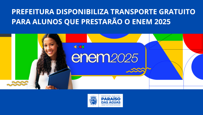 A Secretaria Municipal de Educação de Paraíso das Águas irá disponibilizar transporte gratuito para os estudantes do município que prestarão as provas do Exame Nacional do Ensino Médio (ENEM) 2025. As provas serão realizadas nos dias 9 e 16 de novembro no município vizinho de Chapadão do Sul.
