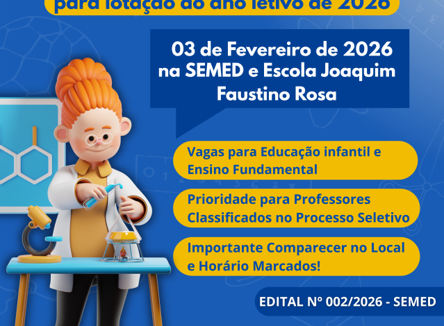 A lotação acontece já nesta terça-feira, 3 de fevereiro, às 08h. O processo visa preencher vagas para o ano letivo de 2026, cobrindo desde a sala de aula regular até projetos específicos e substituições.