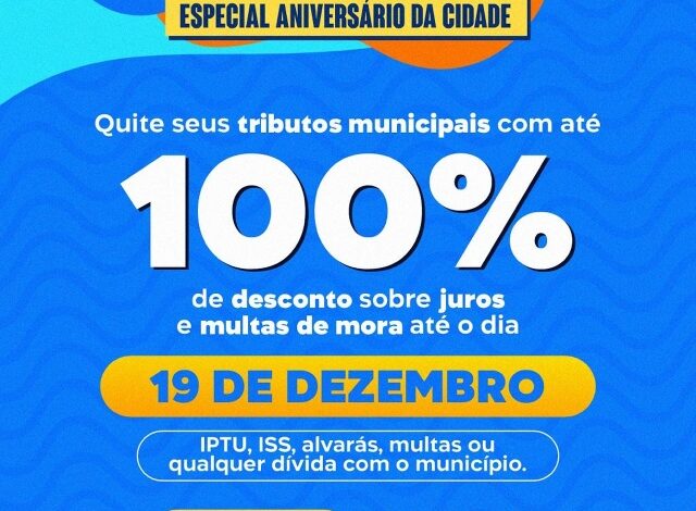 Descontos de até 100% sobre juros e multas de mora para pagamento de: IPTU, ISS, alvarás, multas e quaisquer outras dívidas com o município.