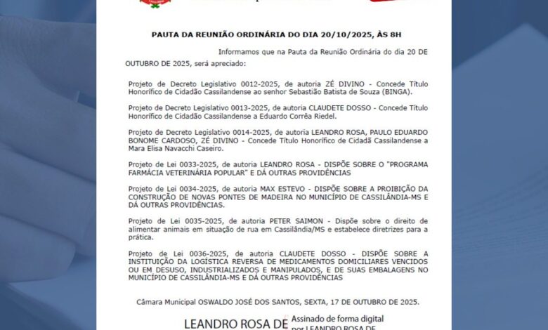 A Câmara Municipal de Cassilândia divulgou a pauta de sua próxima sessão legislativa, nesta segunda-feira, 20 de outubro, que contará com a discussão e votação de sete projetos — três Decretos Legislativos e quatro Projetos de Lei.