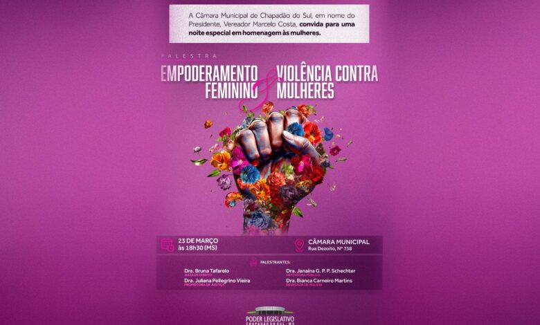 A Câmara Municipal de Chapadão do Sul anunciou a realização de uma noite especial dedicada às mulheres no próximo dia 23 de março de 2026. O evento, focado no empoderamento feminino e no enfrentamento à violência doméstica e de gênero, reunirá as principais vozes do sistema de justiça da região para um diálogo direto com a comunidade.