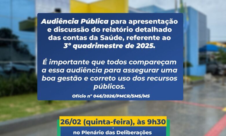COSTA RICA – A Câmara Municipal realiza nesta quinta-feira, 26 de fevereiro de 2026, uma importante Audiência Pública para a prestação de contas da saúde municipal. O foco será a apresentação do Relatório Detalhado do 3º Quadrimestre de 2025.