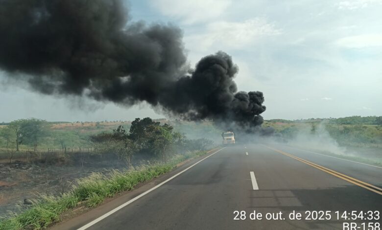 Carreta com produtos químicos pega fogo na BR-158, entre Paranaíba e Aparecida do Taboado
