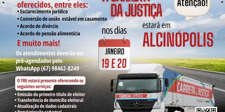 Moradores de Alcinópolis terão acesso a serviços jurídicos gratuitos nos dias 19 e 20 de janeiro, quando a Carreta da Justiça estará instalada no município. A ação é promovida pelo Tribunal de Justiça de Mato Grosso do Sul e integra políticas de interiorização dos serviços do Judiciário.