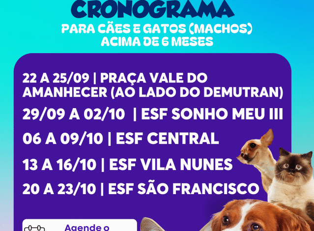 A Prefeitura de Costa Rica, por meio da Secretaria Municipal de Saúde (SMS) e da Vigilância Sanitária, divulgou o cronograma de atendimentos do Castramóvel para os meses de setembro e outubro de 2025. A unidade móvel realizará procedimentos em cães e gatos machos a partir de seis meses de idade, em diferentes pontos do município.