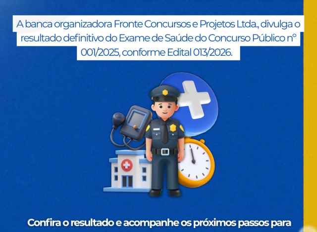 A Prefeitura de Costa Rica deu mais um passo para a concretização do Concurso Público da Guarda Civil Municipal. Foi publicado na última quinta-feira (8), no Diário Oficial do Município, o Edital nº 013/2026, que oficializa o resultado definitivo do Exame de Saúde.