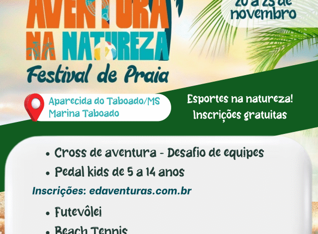 Aparecida do Taboado, MS – A Marina Taboado, às margens do Rio Paraná, será o cenário de mais uma edição do Aventura na Natureza – Festival de Praia, e a Prefeitura de Aparecida do Taboado abriu oficialmente as inscrições para as modalidades esportivas. O festival acontece entre os dias 20 e 23 de novembro, unindo esporte, integração e natureza.