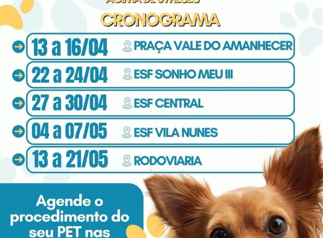 COSTA RICA (MS) – A Prefeitura de Costa Rica, através do setor de Vigilância em Saúde, definiu o itinerário do Castramóvel para os próximos dois meses. A iniciativa visa facilitar o acesso dos tutores ao serviço gratuito, promovendo o controle de natalidade e a posse responsável no município.