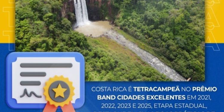 O município de Costa Rica garantiu, no dia 2 de dezembro de 2025, o primeiro lugar no 5º Prêmio Band Cidades Excelentes — na categoria para cidades com até 30 mil habitantes — conquistando o tetracampeonato, após vitórias também em 2021, 2022 e 2023.