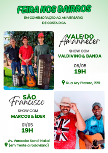 O prefeito de Costa Rica, Cleverson Alves dos Santos,(PP) convida toda a população e visitantes para participarem das feiras especiais nos bairros, que fazem parte das comemorações do 46º aniversário de emancipação político-administrativa do município, celebrado no dia 12 de maio de 2026.