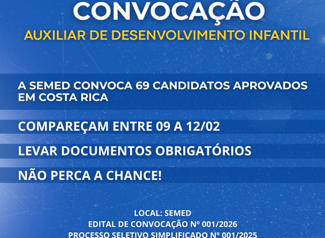 Atenção você que participou do Processo Seletivo da Prefeitura de Costa Rica. Saiu o chamamento e o prazo é curto! O Prefeito Delegado Cleverson convocou 69 candidatos aprovados para o cargo de Auxiliar de Desenvolvimento Infantil.