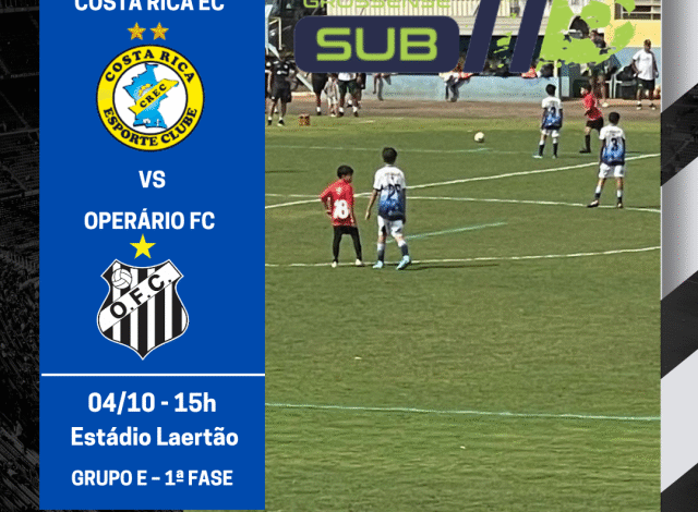 O Costa Rica Esporte Clube (CREC) entra em campo neste sábado, 4 de outubro de 2025, para enfrentar o Operário FC pelo Campeonato Sul-Mato-Grossense Sub-11. A partida será realizada no Estádio Laertão, em Costa Rica/MS, às 15h.