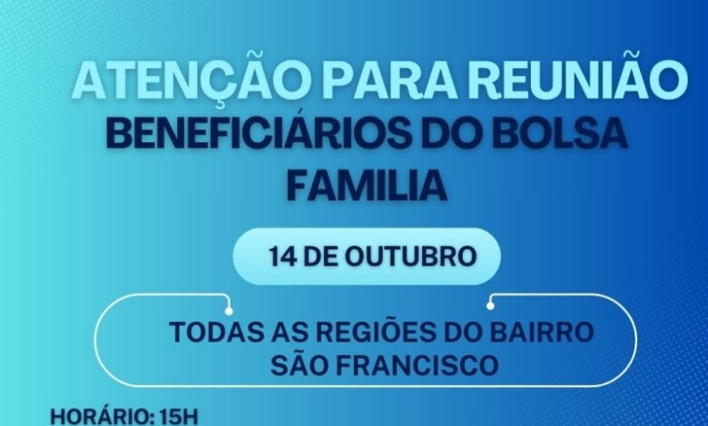 A Prefeitura de Costa Rica realizará hoje, terça-feira, 14 de outubro de 2025, uma reunião socioeducativa obrigatória para as famílias beneficiárias do Programa Bolsa Família que residem no bairro Jardim São Francisco e arredores.