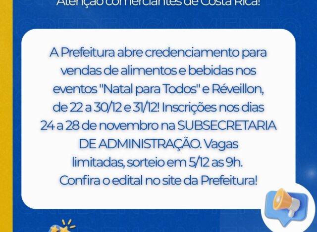 Costa Rica, MS – A Prefeitura de Costa Rica lançou um chamamento público voltado a comerciantes interessados em vender alimentos e bebidas na Praça de Alimentação dos grandes eventos de fim de ano do município. A oportunidade abrange o “Natal para Todos” (22 a 30 de dezembro) e o Réveillon (31 de dezembro), este último realizado no Centro de Eventos Ramez Tebet.