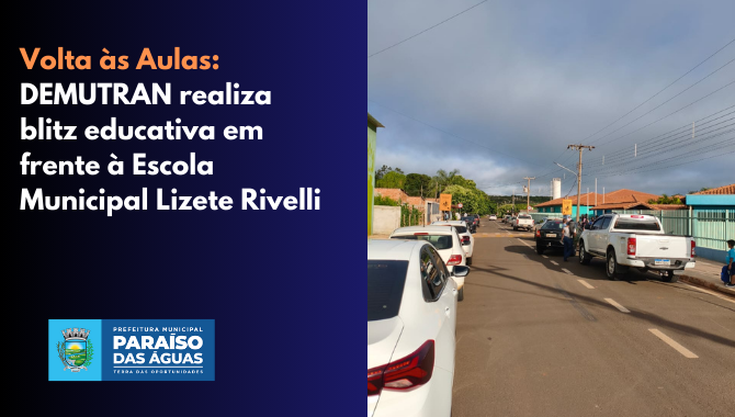 Com a volta às aulas, o trânsito em Paraíso das Águas ficou mais movimentado, e o Demutran foi para a rua garantir a segurança da criançada. Ontem e hoje (10), a equipe realizou uma blitz educativa bem na frente da Escola Municipal Lizete Rivelli.