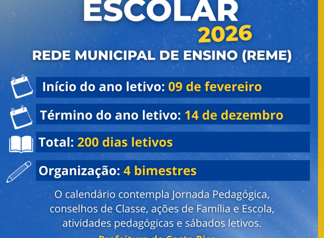 A Secretaria Municipal de Educação (SEMED) de Costa Rica oficializou, por meio da Resolução nº 7.180, as diretrizes para o funcionamento da Rede Municipal de Ensino em 2026. O documento detalha o cronograma completo, desde o período de formação dos professores até o encerramento das atividades pedagógicas, garantindo transparência e planejamento para as famílias e servidores.