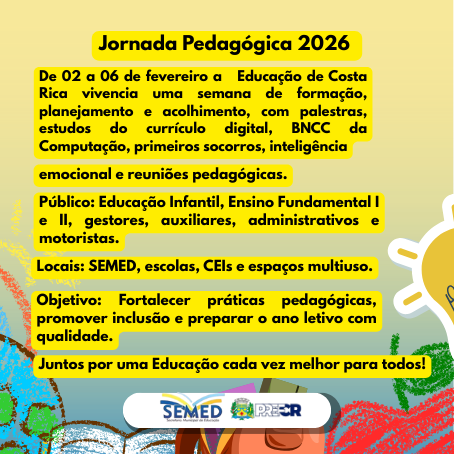 A Prefeitura de Costa Rica, por meio da SEMED (Secretaria Municipal de Educação), deu início nesta segunda-feira (02) à Jornada Pedagógica 2026. O evento, que marca o pontapé inicial das atividades escolares, segue até o dia 6 de fevereiro (sexta-feira).
