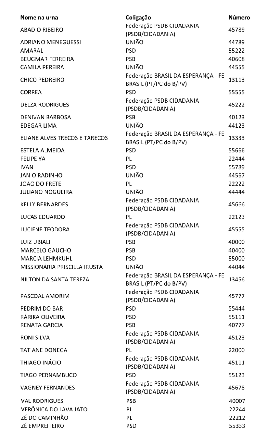 Já os candidatos a vereadores são 38 nomes na disputa. Veja abaixo a lista dos concorrentes, a coligação pertencente e o número com o qual estão concorrendo: