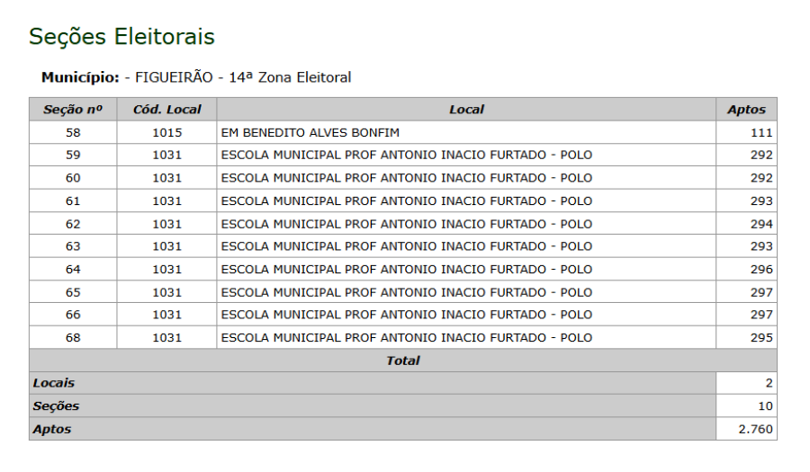 A cidade terá 2 locais de votação, com 10 seções para a população no dia 6 de outubro. O município possui 2.760 eleitores.