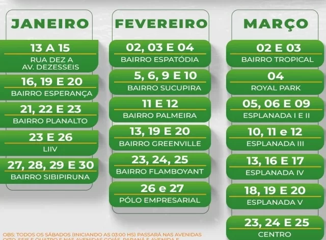 O cronograma detalhado por bairros (Jan/Fev/Mar) já está disponível no site e redes sociais da Prefeitura.