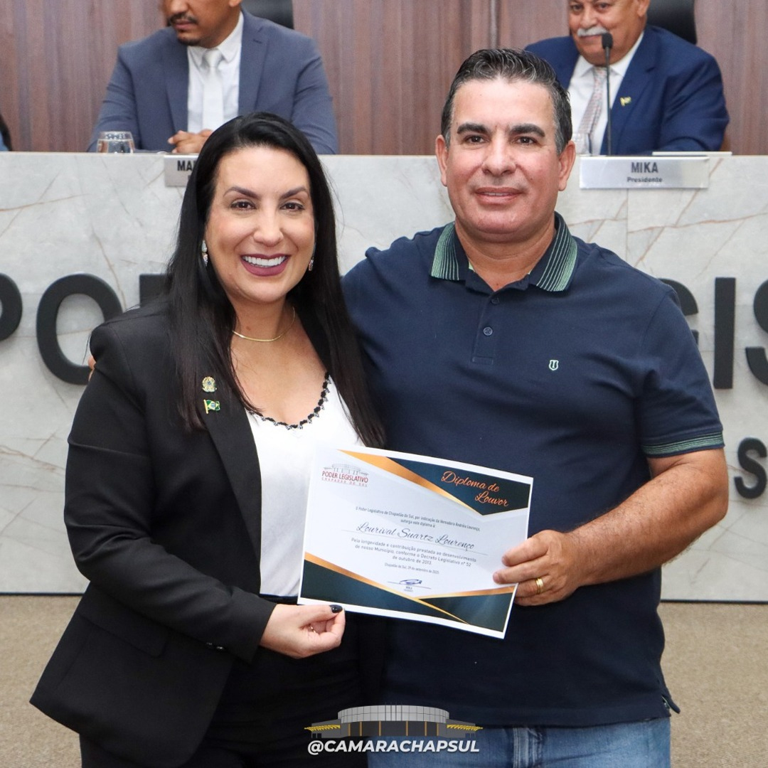 Lourival Lourenço Junior, neste ato representando seu pai para receber sua honraria das mãos da Vereadora Andréia Lourenço
