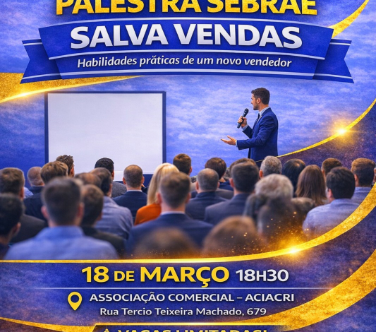 Se você é empreendedor, comerciante ou trabalha com vendas em Costa Rica, esta é a oportunidade ideal para dar um “up” nos seus resultados. A Prefeitura, em parceria com a ACIACRI (Associação Comercial, Industrial e Agropastoril) e o Sebrae, promove nesta quarta-feira, 18 de março de 2026, a palestra “Salva Vendas – Habilidades práticas de um novo vendedor”.