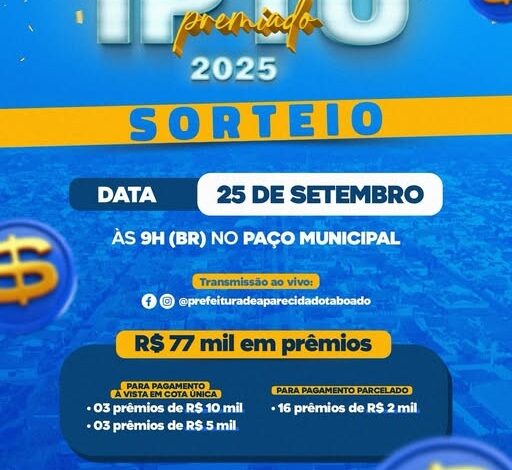Nesta quinta-feira, 25 de setembro, o município realiza o sorteio do IPTU Premiado 2025, uma iniciativa que incentiva os moradores a manterem seus impostos em dia. A cerimônia acontecerá no Paço Municipal, a partir das 9h, e terá transmissão ao vivo pelas redes sociais da Prefeitura.