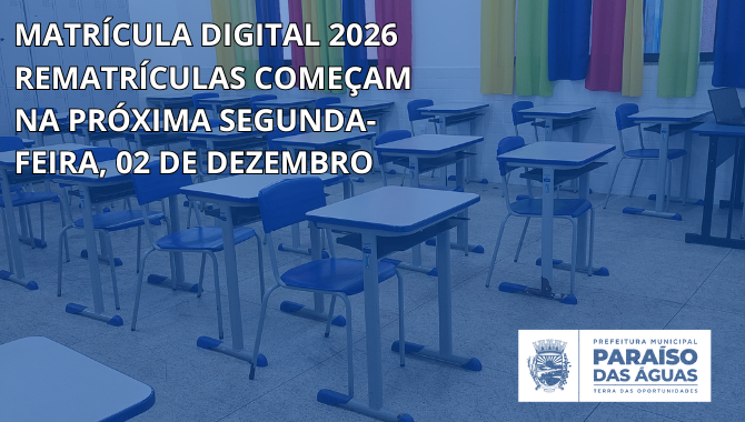 A Secretaria Municipal de Educação de Paraíso das Águas divulgou nesta semana o calendário oficial de rematrículas e matrículas para o ano letivo de 2026. Pais e responsáveis devem ficar atentos às datas, pois o não cumprimento dos prazos pode resultar na perda da vaga do estudante.