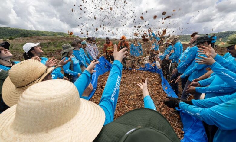 Para cobrir uma área tão grande e garantir que a floresta cresça forte, o Instituto Taquari Vivo (ITV) e a empresa Restaura estão utilizando a técnica da muvuca. Em vez de plantar mudas uma a uma, eles misturam mais de quatro toneladas de sementes de diferentes espécies e as espalham pelo solo preparado.