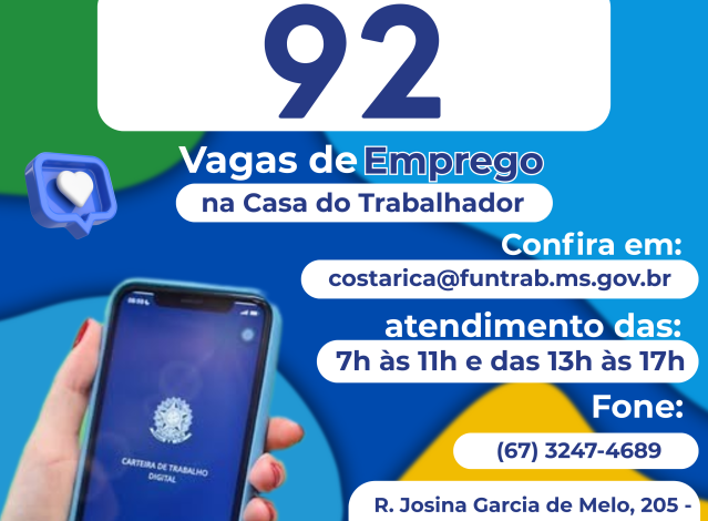 COSTA RICA – A prefeitura municipal, em parceria com a Funtrab (Fundação do Trabalho de MS), disponibilizou uma lista robusta de oportunidades que visam fortalecer a economia local. A maioria das funções exige Ensino Fundamental completo, tornando as vagas acessíveis a uma grande parcela da população.