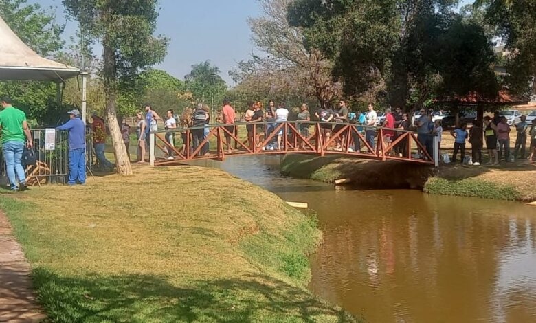 Uma longa fila de pessoas de todas as idades se formou na manhã desta quinta-feira (18) no Parque do Espelho D’Água, em Paranaíba. Em troca de 1 kg de alimento não perecível, cada participante pôde escolher uma muda de árvore entre as 33 espécies disponibilizadas pela Secretaria Municipal de Meio Ambiente.