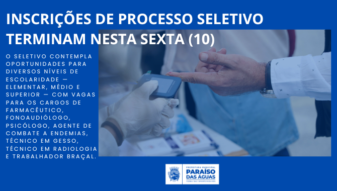 A Prefeitura de Paraíso das Águas tem inscrições abertas para o Processo Seletivo Simplificado nº 006/2025 até a próxima sexta-feira, 10 de outubro. O seletivo busca preencher cargos e formar cadastro reserva de profissionais para a Secretaria Municipal de Saúde.
