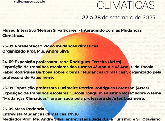 A programação local foi organizada em parceria com professores e escolas do município. No dia 23, o professor André Silva conduzirá uma apresentação em vídeo sobre mudanças climáticas. Já no dia 24, a professora de Artes Irene Rodrigues Ferreira exibirá produções artísticas dos alunos do 4º Ano A e B da Escola Fábio Rodrigues Barbosa. No dia 25, será a vez da professora Lucimeire Pereira Rodrigues Lorenzon apresentar trabalhos da Escola Joaquim Faustino Rosa. Encerrando o ciclo, no dia 26, haverá uma mesa-redonda mediada por André Silva, com a participação da guia de turismo Jade e do pioneiro Otaviano Ribeiro de Menezes.
