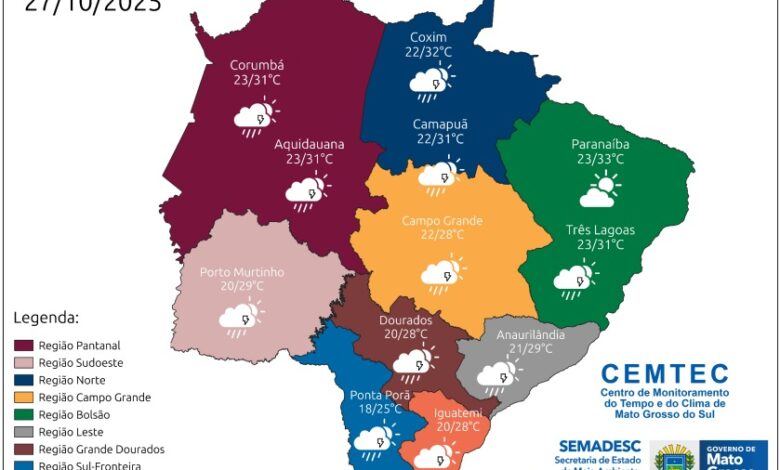 Entretanto, no início da próxima semana, a chegada de uma frente fria trará chuva já no domingo (26) em grande parte de Mato Grosso do Sul. Pode ocorrer tempestades de raios, rajadas de vento e eventual queda de granizo. Espera-se acumulados de 30 milímetros em 24 horas, sobretudo nas regiões Centro e Sul do Estado. A chuva prossegue na segunda-feira (27) e só há possibilidade de tempo aberto na região do Bolsão.