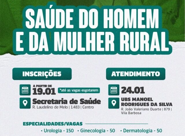 A população da zona rural de Aparecida do Taboado terá uma oportunidade de colocar a saúde em dia com especialistas sem precisar viajar. A partir da próxima segunda-feira (19 de janeiro), a Secretaria Municipal de Saúde abre as inscrições para o programa “Saúde do Homem e da Mulher Rural”.