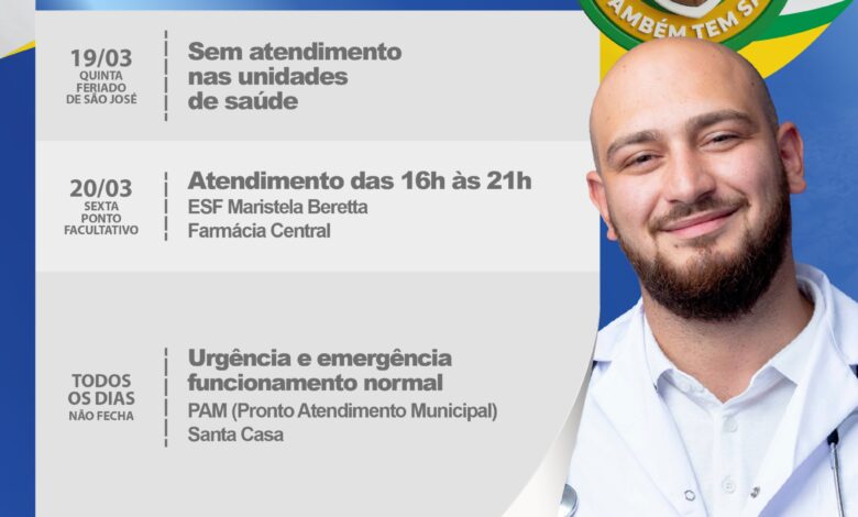 20 de Março (Sexta-feira – Ponto Facultativo): As unidades básicas permanecerão fechadas, porém, haverá atendimento em horário estendido das 16h às 21h exclusivamente no ESF Maristela Beretta e na Farmácia Central.