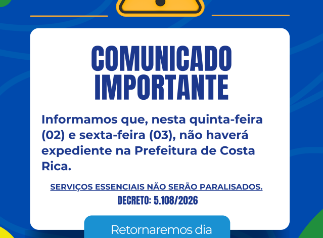 COSTA RICA (MS) – A decisão, publicada no Diário Oficial do Município, abrange todos os órgãos da administração pública direta e indireta. Segundo o prefeito Cleverson Alves, o objetivo é permitir que os servidores públicos possam se dedicar às celebrações religiosas e ao convívio familiar durante o período sagrado.
