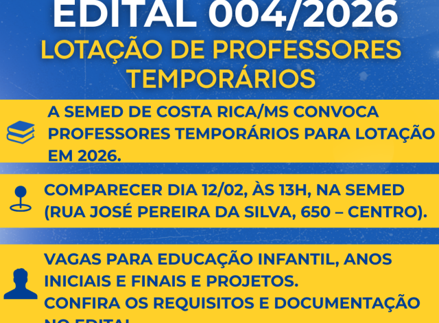 COSTA RICA – A Prefeitura de Costa Rica, por meio da Secretaria Municipal de Educação (SEMED), publicou o Edital nº 004/2026, convocando professores classificados no Processo Seletivo Simplificado (PSS 001/2024) para a escolha de vagas. A medida visa preencher postos em projetos, programas e substituições de professores efetivos licenciados.