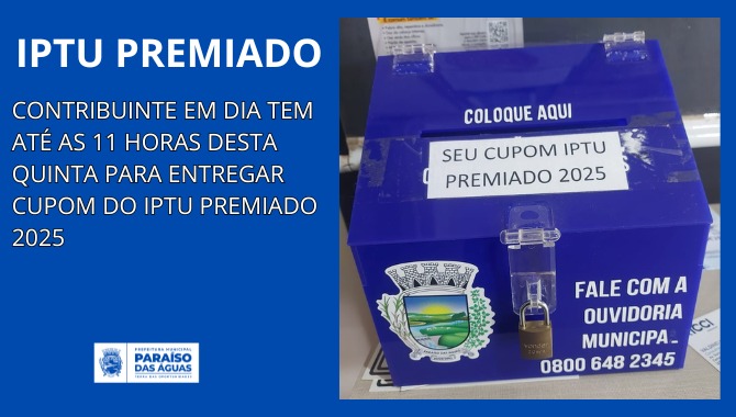 O tempo está acabando para os contribuintes de Paraíso das Águas que estão em dia com o IPTU concorrerem ao IPTU Premiado 2025. O prazo final para entregar o cupom preenchido e garantir a participação no sorteio é nesta quinta-feira, 4 de dezembro, às 11 horas.