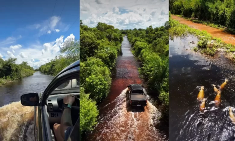 Além da exuberância das águas, as imagens flagram um pouco da fauna da região, com capivaras nadando às margens da estrada, deixando o espetáculo ainda mais completo.