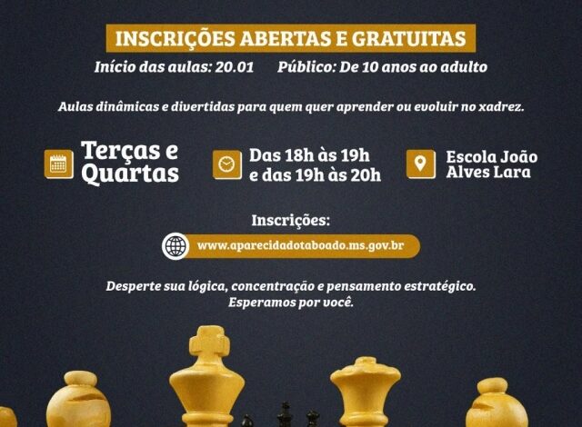 O Governo Municipal de Aparecida do Taboado anunciou a expansão de seu calendário esportivo com uma novidade para 2026: a inclusão de aulas de Xadrez totalmente gratuitas para a população.